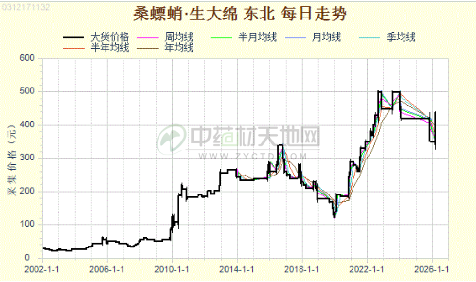自2020年新冠疫情突发以来,受境外朝鲜货源入境受阻影响,加上国内野生资源持续萎缩等多重因素影响,市场整体货源供应持续偏紧,引发行业内高度关注,桑螵蛸行情由此进入稳步上行通道,并在此后长达五年的时间里始终保持高位运行态势。2025年产新前后,桑螵蛸行情曾出现阶段性明显下滑,市场一度陷入观望。但此次下行走势并未持续太久,价格随即触底回升,呈现出强势反转行情,其中生大绵价格从产新初期的300元一路上涨至目前的440元,反弹力度显著。那么,本轮桑螵蛸产新后先跌后涨的反转行情,背后究竟蕴藏着怎样的市场逻辑?其未来走势又将如何演变?本文将结合货源供应、市场需求及行业环境等方面展开深度解析。