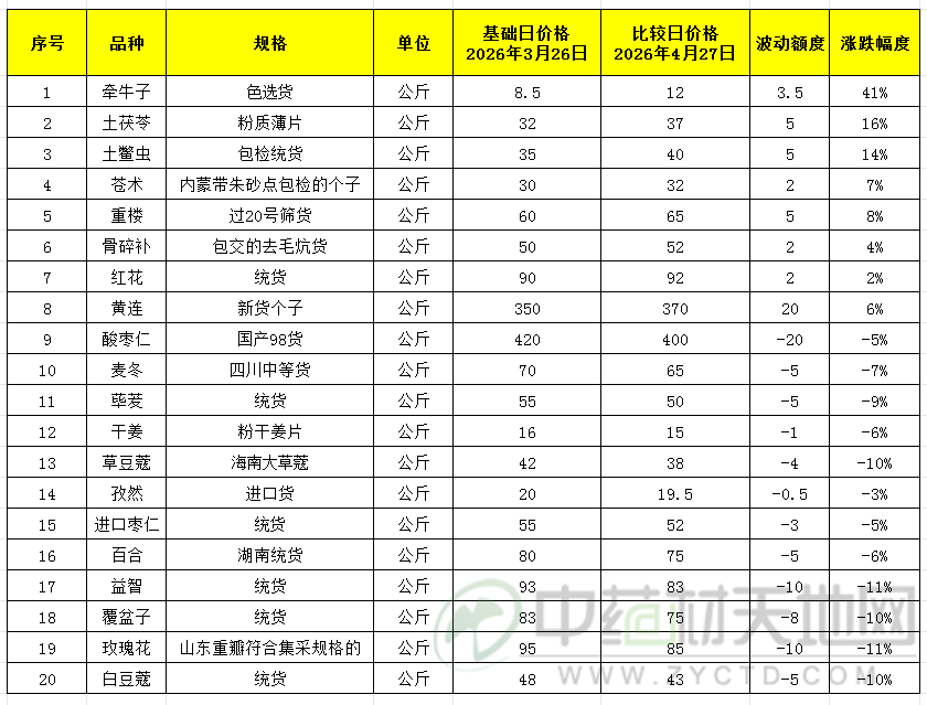 牵牛子新货减产,再加上有商看好并持续购进,行情短时明显上涨;土鳖虫产新有商逢低购进,行情反弹后转稳;云南红花已进入产新后期,到产地购货的经销商明显增多,价格随之小幅上涨,市场价格也有一定上扬;秦艽有商视价低积极购进,产地价格小幅上调,市场行情保持坚挺;苍术最近购货积极又增加,产地一直走动好于市场,价格上扬后目前趋于坚挺;延胡索虽产区开始采挖,但全检货要价依然坚挺;红花受产地价格小幅上涨,市场行情稳中显升;黄连产区人气交旺,整体行情有所上扬,但市场表现不及产区,出现了倒挂的现象;南五味子尤以包检合格货价格坚挺,其它规格行情基本稳定;土茯苓来货量不大,随着货源陆续交易,整体行情有所上扬;全瓜蒌有商关注,要价高于年前;猪苓受集采影响,大统货要价坚挺;骨碎补最近产地价格略显上扬,市场行情小幅回升;重楼受集采影响,关注力度上升,行情也有一定上扬;菟丝子又有商关注并购进,本期价格处于小幅上涨。