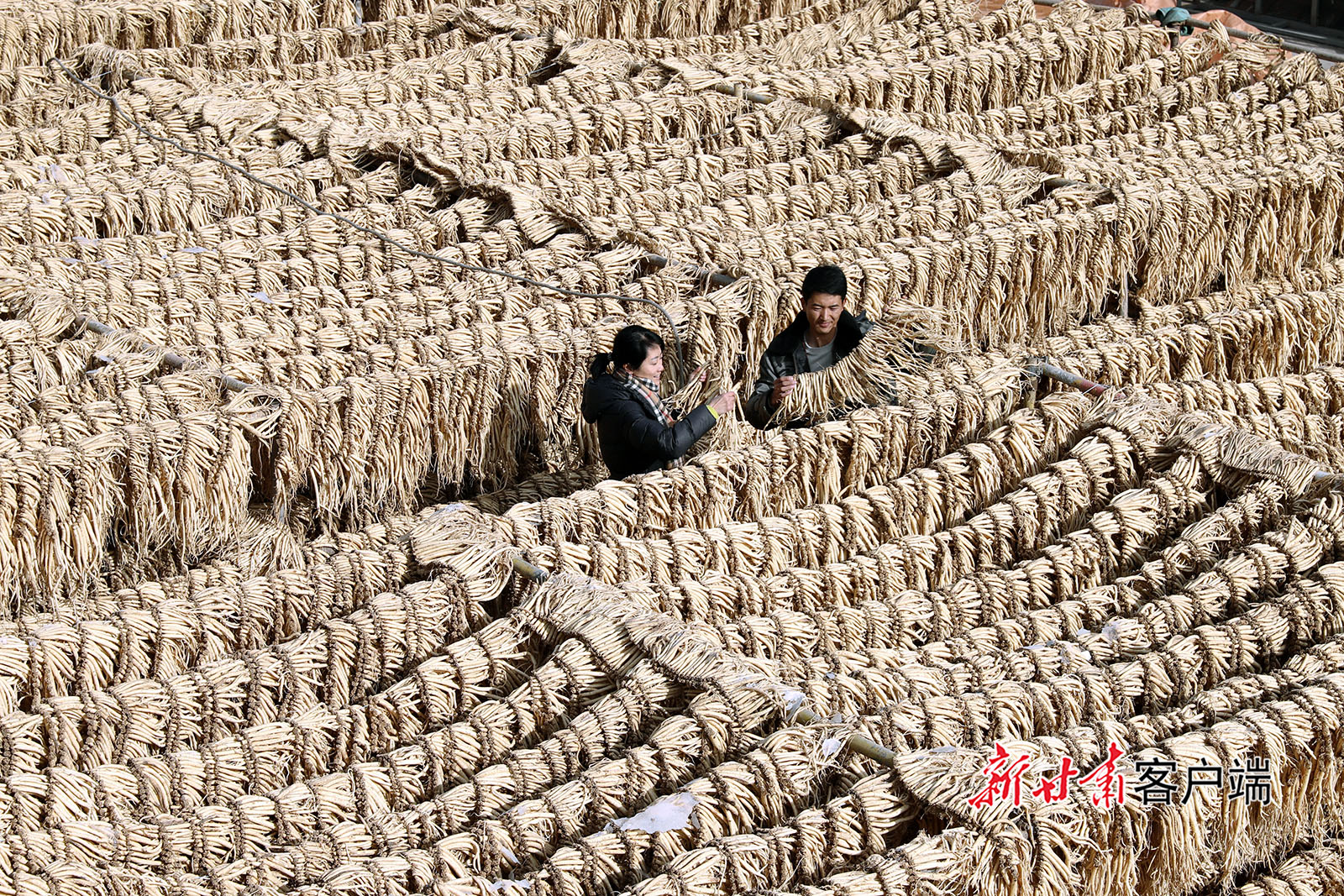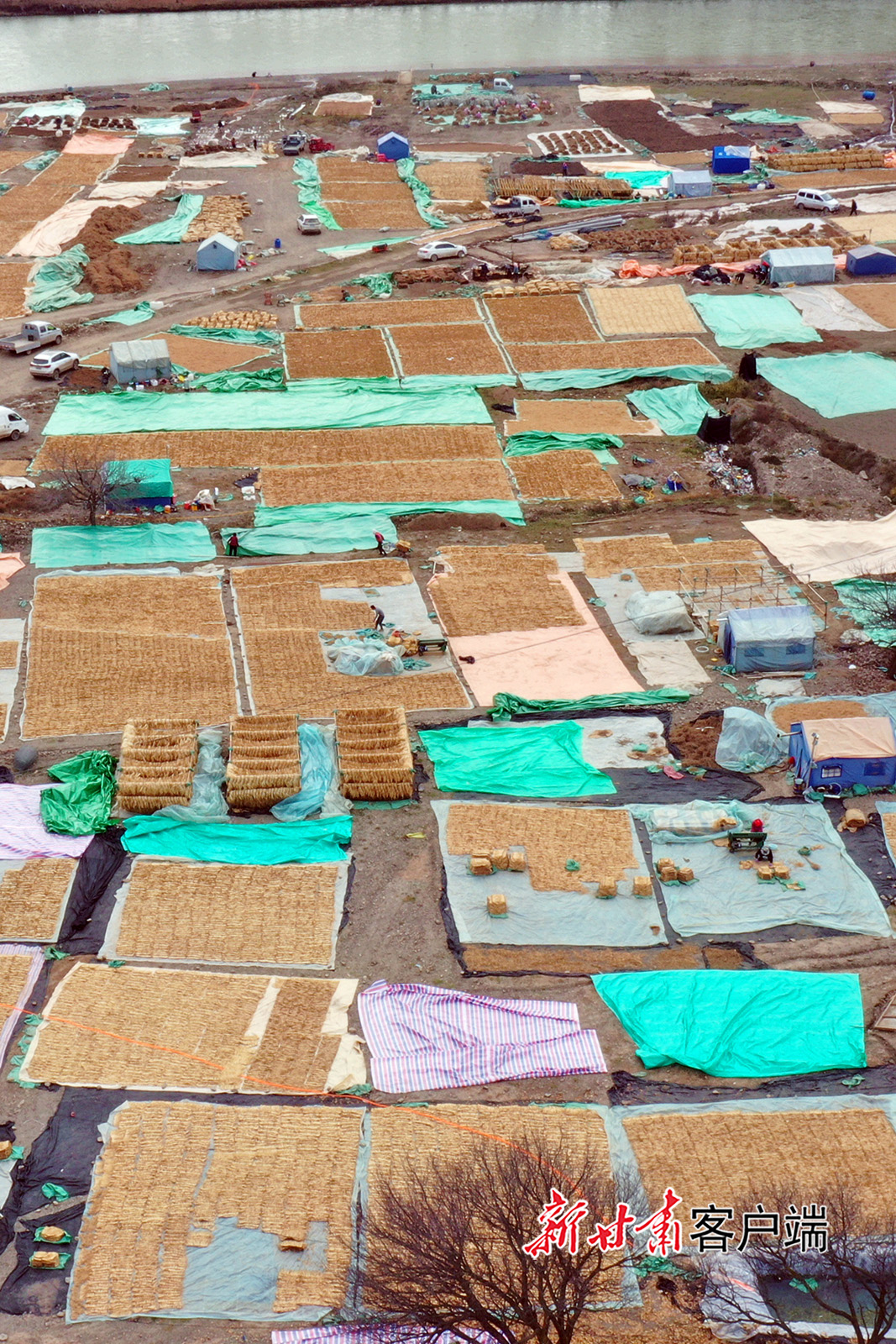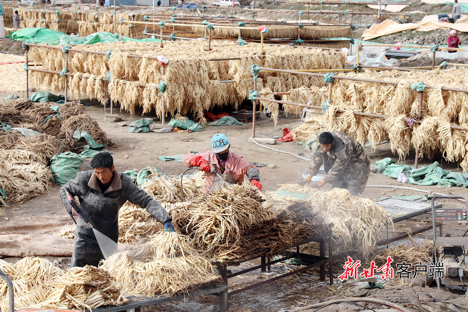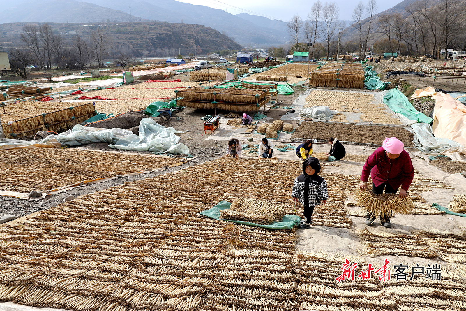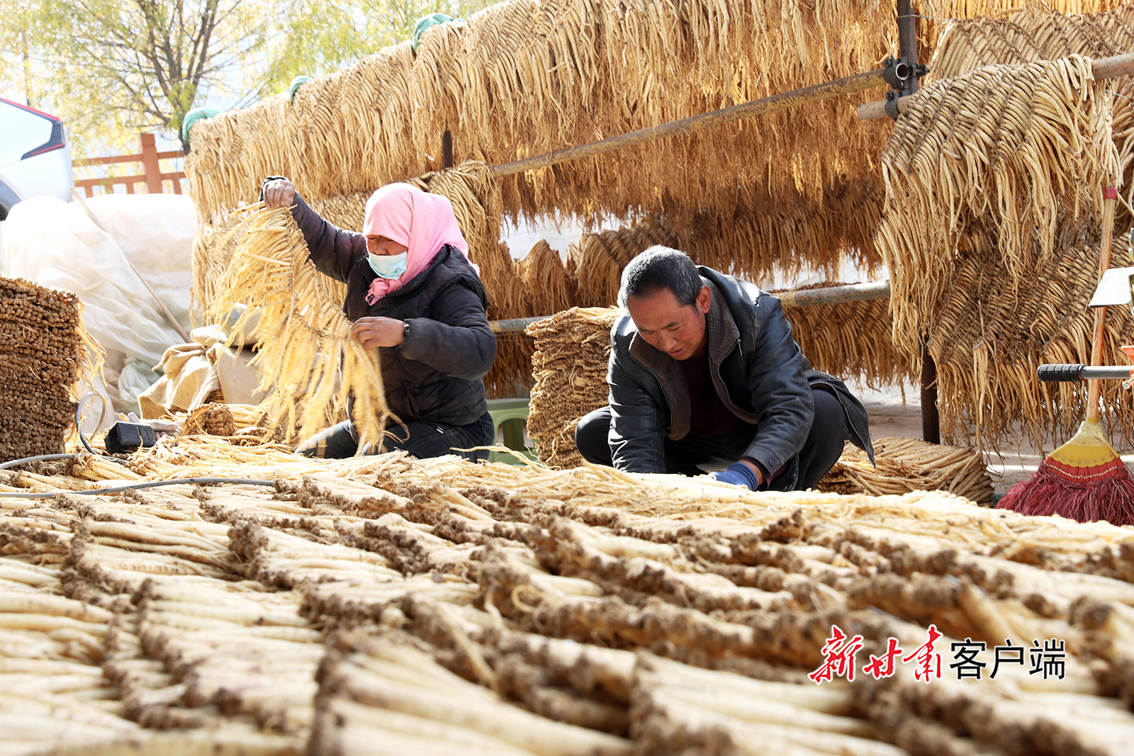 11月19日,岷县维新镇施旗村农民在整理晾晒党参。初冬时节,岷县洮河两岸药材飘香,群众积极开展中药材整理晾晒、加工销售工作,中药材产业绘就出乡村振兴“丰”景图。